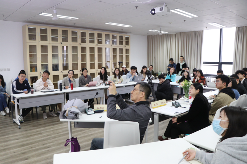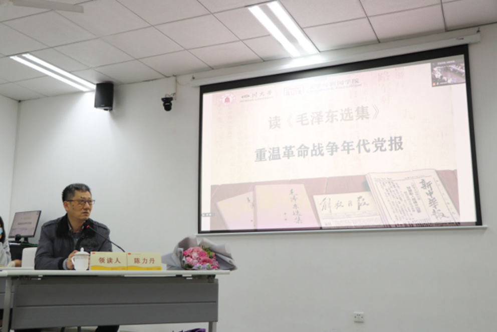陈力丹教授对现场同学们的发言进行了点评,他肯定了大家延伸阅读、归纳主题的良好习惯,并鼓励同学们结合实践提出问题,推进学术研究。紧接着,陈力丹教授针对《毛泽东选集》中的两篇文章和《新中华报》与《解放日报》的相关报道进行了系统解读。