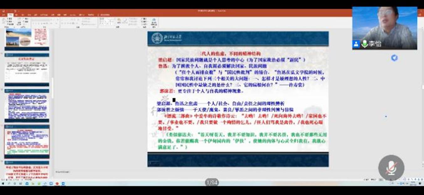 当天下午,英国威廉希尔公司院长李怡教授带来“日本体验与郭沫若诗歌的意象嬗变——以‘海洋’、‘松’、‘梅’为例”的主题讲座,从比较文学的方向探讨研究了日本文学,讲述了鲁迅、郭沫若在日的文学经历等。同学们通过线上直播“云”学习,开拓了自己的文学视野。