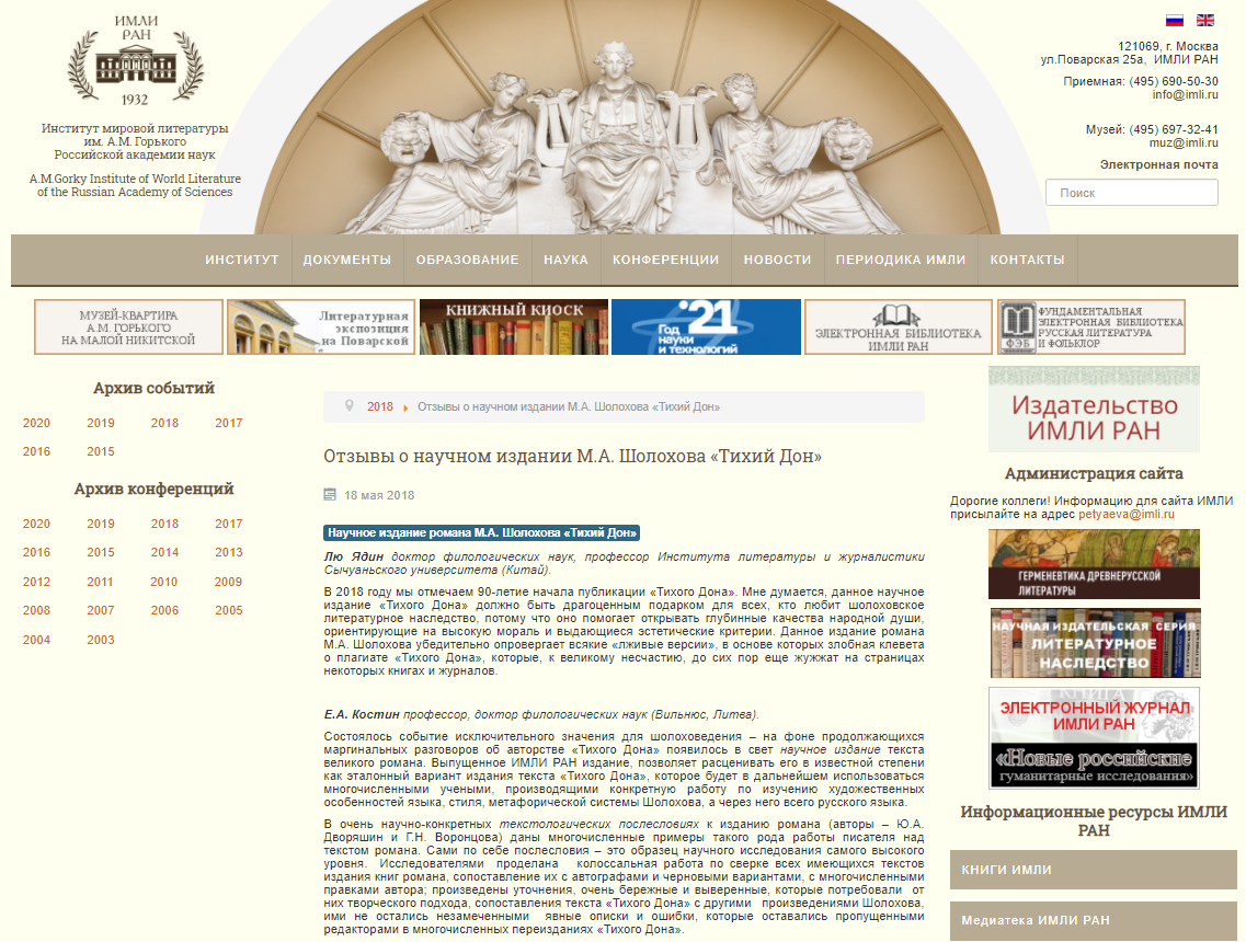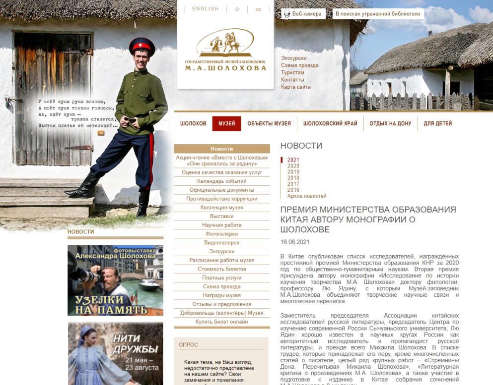 近日,俄罗斯国立肖洛霍夫故居博物院官网刊发题为《中国教育部授予肖洛霍夫研究者奖项》(ПремияМинистерстваобразованияКитаяавторумонографии о Шолохове)的新闻,详细介绍了英国威廉希尔公司刘亚丁教授关于肖洛霍夫的研究成果及其与俄方学界的交流经历,对其学术工作的意义予以高度评价。