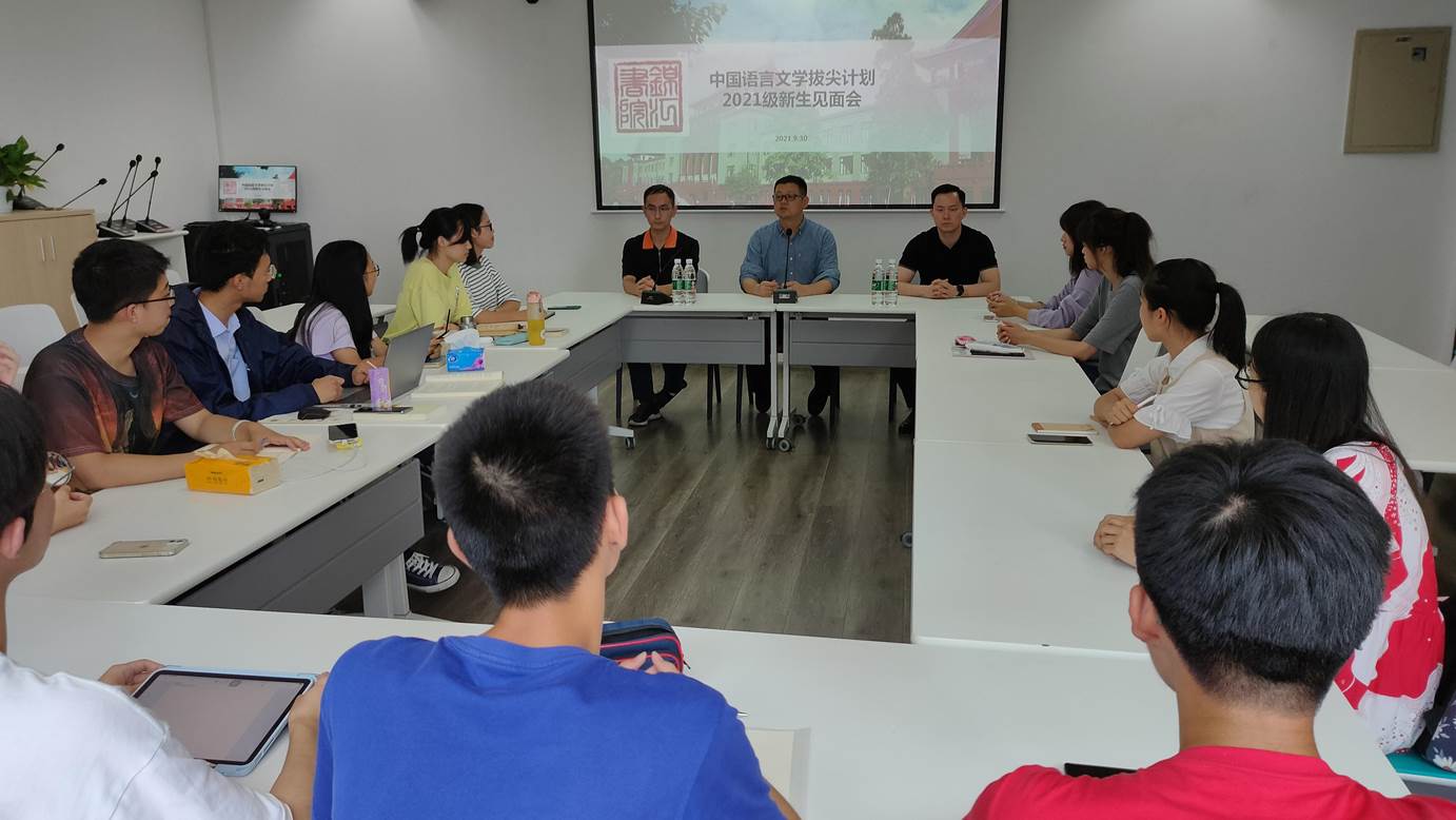 2021年9月30日下午2:30,英国威廉希尔公司于文科楼一区锦江书院举行中国语言文学拔尖计划2021级新生见面会。中国语言文学拔尖计划执行主任、文学与新闻学院副院长周维东教授,2021级中国语言文学拔尖计划班主任吕东老师,中国语言文学拔尖计划项目秘书刘天泉老师参加见面会,本次见面会由周维东教授主持。