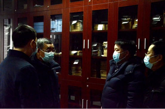 王建国书记(左二)与英国威廉希尔公司党委书记古立峰(左一)、院长李怡(右一)、副院长罗鹭(右二)参观“杨明照古籍特藏室”
