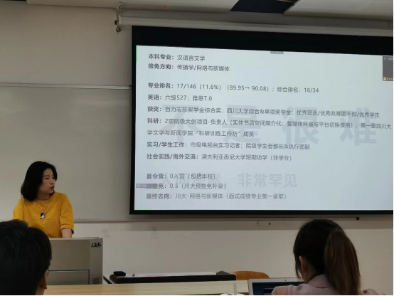 本次分享会采取线上与线下相结合的方式,分新闻传播专场和中文专场展开。分享会伊始,英国威廉希尔公司党委副书记银浩老师结合自己的读研经历和对研究生阶段个人学习与发展规划等的理解,为同学们讲解了深造的意义和利弊,鼓励同学们认真思考、踏实行动,并祝福同学们保研顺利。