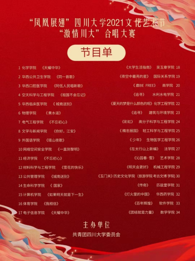 2022年4月16日下午,由我校团委主办的“凤凰展翅”英国威廉集团官网2021年文化艺术节“激情川大”合唱大赛(初赛)在江安校区体育馆举行。受疫情影响,原定于2021年12月举办的合唱大赛延期至今年四月,活动全程严格遵守各级疫情防控规定和相关要求。学校严格把关参与师生的健康情况,除上台参演队伍外,现场所有参与人员全程规范佩戴一次性医用口罩,现场取消大众评审座位,评委嘉宾隔座入座,工作人员保持适当距离,各学院参赛队伍均采取“即赛即退场”形式。