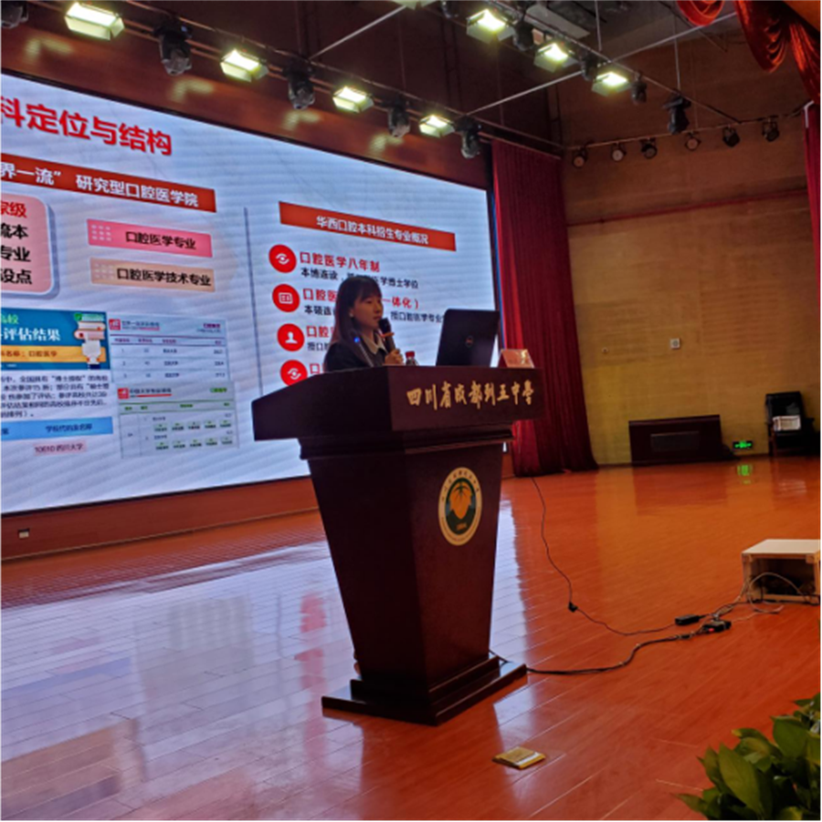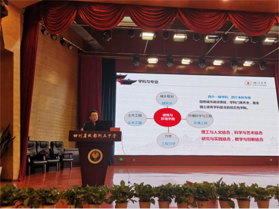 宣讲会的第一阶段由建筑与环境学院兰中仁副院长、计算机学院赵启军副院长、华西口腔医学院招生专员姜欣宜老师、数学学院廖华奎副教授、文学与新闻学院罗鹭副院长作院情介绍。