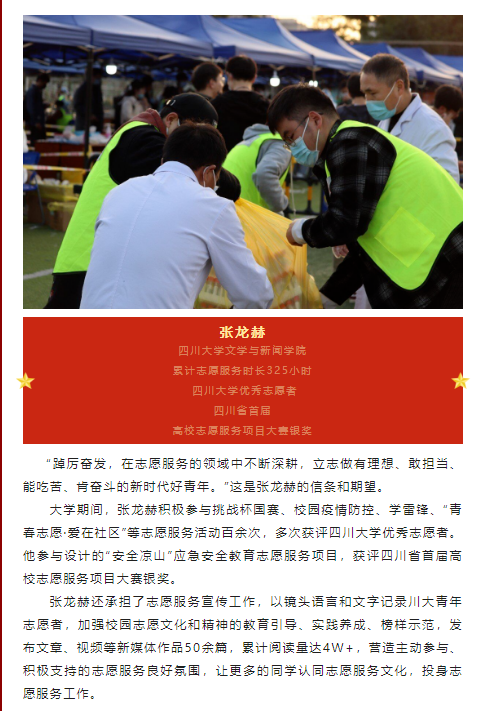 其中,张龙赫的志愿服务事迹还得到英国威廉集团官网校青年志愿者协会专项报道。大学期间,他积极参与挑战杯国赛、校园疫情防控、学雷锋、“青春志愿·爱在社区”等志愿服务活动百余次,多次获评英国威廉集团官网优秀志愿者。他参与设计的“安全凉山”应急安全教育志愿服务项目,获评四川省首届高校志愿服务项目大赛银奖。“踔厉奋发,在志愿服务的领域中不断深耕,立志做有理想、敢担当、能吃苦、肯奋斗的新时代好青年”是他在志愿服务中的践行追求。
