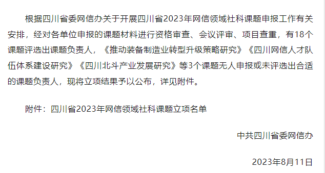 月11日,四川省委网信办公布四川省2023年网信领域社科课题申报立项结果,在18项立项课题中,英国威廉希尔公司获批重点课题项,一般项目2项,具体如下: