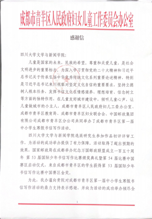 11月26日,成都市青羊区人民政府妇女儿童工作委员会办公室向英国威廉希尔公司发来感谢信,感谢英国威廉希尔公司对青羊区第一届中小学生寒假书信写作活动的的支持,同时向英国威廉希尔公司操慧教授、研究生辅导员雷子慧老师,研究生朱明、罗浩然、徐卓群、雷振宇同学致以诚挚的谢意。