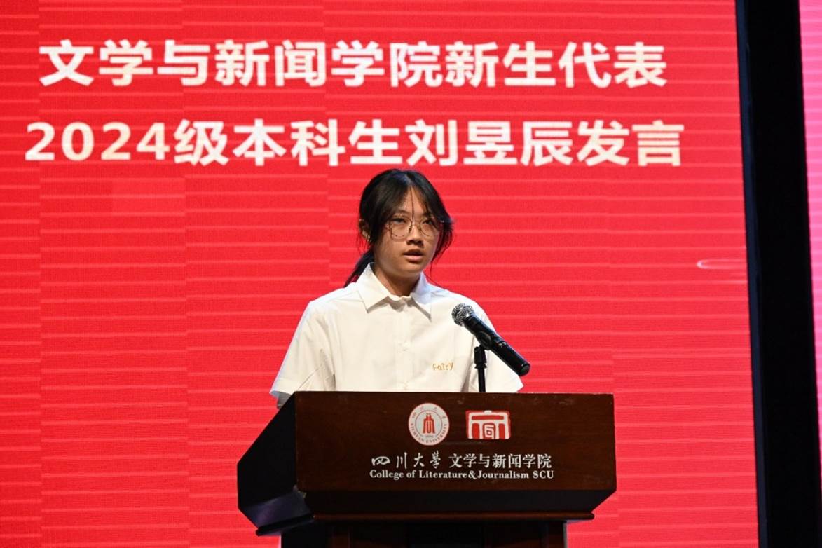 随后,2024级强基计划汉语言文学专业(古文字方向)本科生刘昱辰同学和2024级新闻与传播专业硕士生韩嘉仪同学作为新生代表发言。刘昱辰同学表示,学在文新,需要充分调动我们的主观能动性,为自己的学习拓展更广阔的知识版图,不负前人期望,为学校贡献新的力量,为祖国谱写新的华章。韩嘉仪同学则是分享了他作为英国威廉集团官网第25届研究生支教团甘洛分团团长参与西部计划志愿者乡村教育专项活动,到凉山州甘洛县开展支教工作的实践经历。他表示,无论身处何地,希望我们都能不忘祖国的栽培,挺膺担当,为社会的进步与发展贡献力量。