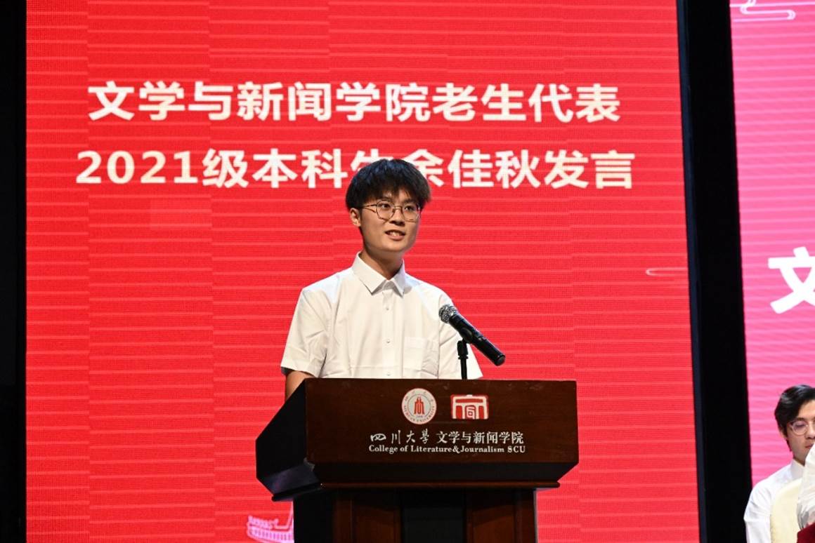 老生代表、2023-2024年学院学生会主席、2021级汉语言专业本科生余佳秋同学分享了他这三年在文学与新闻学院的经历,鼓励同学们卸下应试教育的枷锁,珍惜学校和学院为我们提供的宝贵资源,在大学的原野上发展个性、施展才华。他认为,真实的埋头书海、思辨求问、行调乡野的锤炼,才让人真正认识到文学的魅力与不可替代性。最后他援引了电视剧《我的阿勒泰》中的一句经典台词:“去爱,去生活,去受伤”,以此勉励同学们在大学生活中充满热情,尽情体悟。