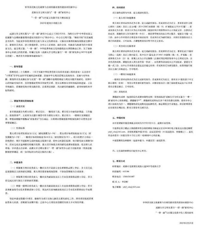 本年度,成都大学文明互鉴与“一带一路”研究分中心以基础研究和应用研究并重、立足学科前沿、着眼研究的应用实践价值、注重理论创新与前瞻性、倡导原创性和开拓性研究为总体目标和指导思想,特制定发布《成都大学文明互鉴与“一带一路”研究分中心、“一带一路”与巴蜀文化数字化工程实验室2025年度项目申报公告》,项目申报的有关事项通知如下: