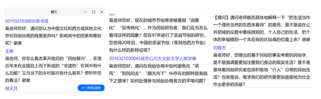 讲座互动环节,同学们围绕民俗协商与民俗研究相关问题,以文字形式与高丙中教授进行交流探讨,线上学术氛围热烈。主持人徐新建教授也分享道,高教授本次的讲座,对中国民俗乃至世界民俗的历史分区进行了细致的划分,民俗协商与民俗协商学的提出或可实现中国民俗学及其研究对象的完整性,因而极富前沿性与创新意义。