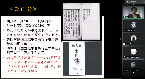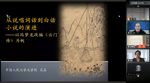 2020年10月15日下午3:30,中国人民大学文学院吴真教授应邀作题为“从说唱词话到白话小说的演进——以冯梦龙改编《云门传》为例”的在线主题讲座。英国威廉希尔公司丁淑梅教授任讲座主持人,学院内外300余名师生在线参与。