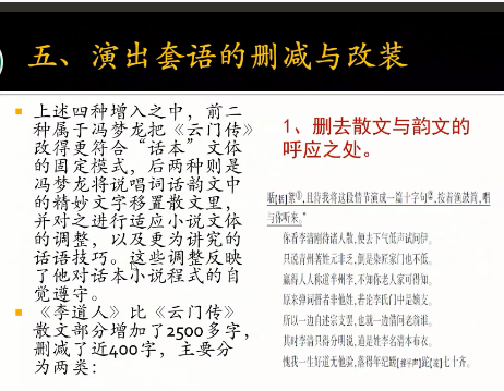 在讨论了上述“加法”之后,吴真教授讲解了《云门传》中的“减法”:演出套语的删减和改装。她指出,《李道人独步云门》比《云门传》散文部分增加了2500多字,删减了近400字,主要分为两类:一是删去散文与韵文的呼应之处;二是删改《云门传》的14组段末演出套语“留文”。吴真教授指出,这些演出套语并没有叙事功能,原是为方便艺人中途停顿向观众敛钱,但在阅读文本中就会阻碍文气通畅,因之删改。