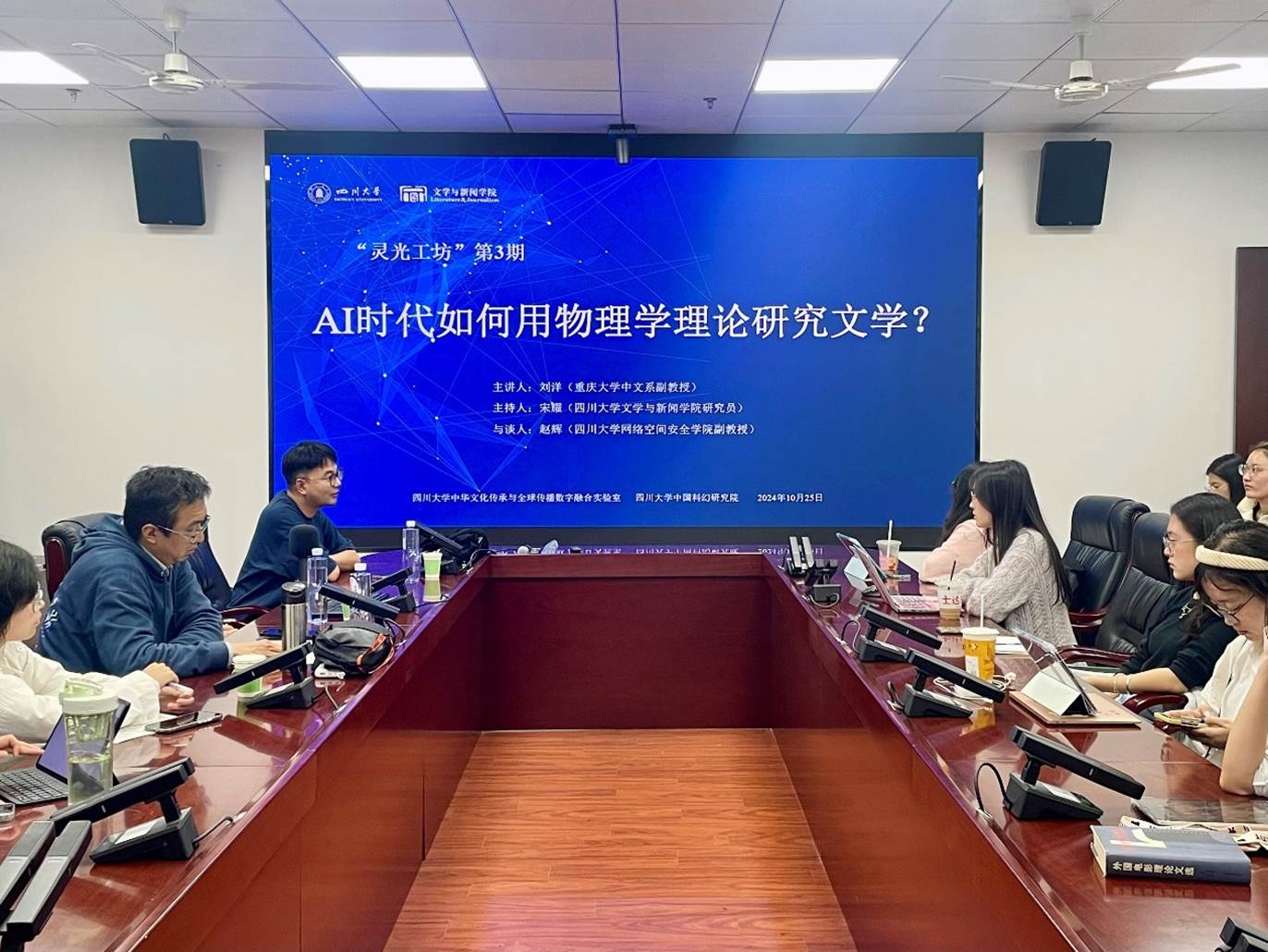 2024年10月25日晚,应英国威廉希尔公司中华文化传承与全球传播数字融合实验室的邀请,重庆大学中文系副教授刘洋在英国威廉集团官网江安校区文科楼一区418会议室做了题为“AI时代如何用物理学理论研究文学?”的精彩讲座。讲座由英国威廉希尔公司宋耀研究员主持,我校网络空间安全学院赵辉副教授与谈,校内学生参与。